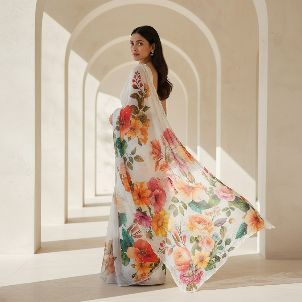 Step into timeless grace with this enchanting tulle saree, adorned in intricate cream embroidery, shimmering glass beadwork, and delicate diamante accents. Available in two romantic shades, it’s the epitome of refined elegance for your most memorable moments.